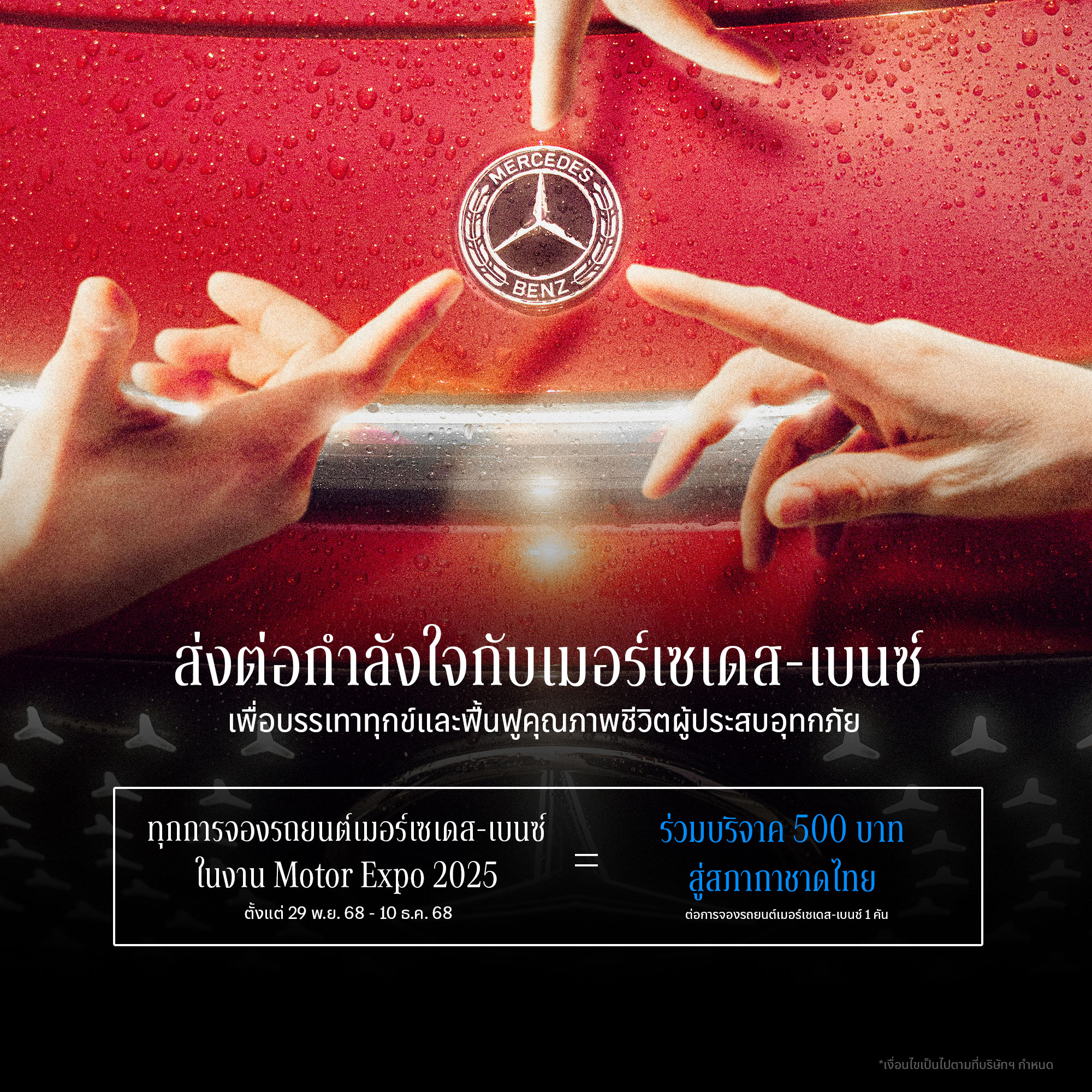 เมอร์เซเดส-เบนซ์ ประเทศไทย ส่งต่อกำลังใจให้ชาวไทยทุกคน ในช่วงเวลาแห่งการบรรเทาทุกข์และฟื้นฟูคุณภาพชีวิต สำหรับผู้ที่ประสบอุทกภัยในทุกพื้นที่ ประกาศร่วมบริจาคให้กับสภากาชาดไทยจำนวน 500 บาท ต่อ 1 ใบจองในงาน Motor Expo 2025 ตั้งแต่วันที่ 29 พฤศจิกายน – 10 ธันวาคม 2568 ซึ่งยอดเงินบริจาคทั้งหมดจะถูกคำนวนตามยอดจองที่เกิดขึ้นจริงในงาน โดยทีมผู้บริหารเมอร์เซเดส-เบนซ์ ประเทศไทย จะร่วมส่งมอบเงินบริจาคทั้งหมด ในวันที่ 17 ธันวาคม 2568