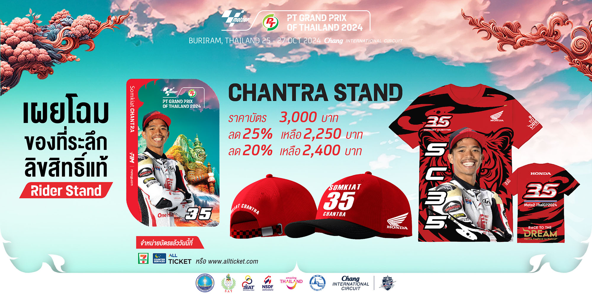 ฝ่ายจัดการแข่งขันโมโตจีพี สนามประเทศไทย นำโดย การกีฬาแห่งประเทศไทย เผยโฉมของที่ระลึกลิขสิทธิ์แท้ โดยเปิดตัวสแตนด์ “ก้อง” สมเกียรติ จันทรา จากฮอนด้า เป็นเสื้อ SC35 ลายเสือ ซึ่งเป็นปีเกิดนักบิดสายเลือดไทยที่จะลงแข่งขันในรุ่น Moto2 ก่อนขยับไปบิดในพรีเมียร์คลาสในปี 2025-2026 นอกจากนี้ยังมี “ฟาบิโอ กวาร์ตาราโร” ชูความเป็น Yamaha Factory Team ใช้สีน้ำเงินที่เป็นสัญลักษณ์ของค่ายยามาฮ่า, ส่วนมาร์ค มาร์เกซ จากเกรซินี่ เรซซิ่ง ชูลวดลาย “กนก” ที่เป็นลายศิลปะที่พบเห็นและเป็นที่นิยมในสถาปัตยกรรมและงานศิลปะไทยแต่โบราณ แสนงดงามอ่อนช้อย มาผสานในการออกแบบของที่ระลึก อวดสายตาสู่ชาวโลก