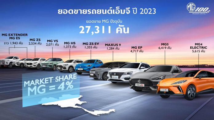 ด้าน นายพงษ์ศักดิ์ เลิศฤดีวัฒนวงศ์ รองกรรมการผู้จัดการ บริษัท เอ็มจี เซลส์ (ประเทศไทย) จำกัด กล่าวว่า “ในปี 2566 ที่ผ่าน เอ็มจีมียอดขายรวมอยู่ที่ 27,311 คัน มีสัดส่วนรถยนต์ไฟฟ้า และรถยนต์สันดาป แบ่งเป็นสัดส่วนอย่างละครึ่ง โดย MG5 ครองแชมป์ยอดขายสูงสุด จำนวน 6,419 คัน ตามด้วย MG4 ELECTRIC จำนวน 5,615 คัน MG EP จำนวน 4,717 คัน MG ZS จำนวน 2,534 คัน MG VS HEV จำนวน 2,071 คัน MG ZS EV จำนวน 1,354 คัน MG HS และ MG HS PHEV จำนวน 1,373 คัน MG MAXUS 9 จำนวน 1,284 คัน MG ES และ MG EXTENDER จำนวนรวม 1,943 คัน และครองส่วนแบ่งทางการตลาด ประมาณ 4%