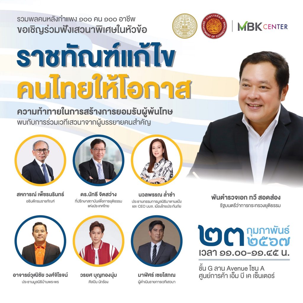 ศูนย์การค้าเอ็ม บี เค เซ็นเตอร์ เดินหน้าจัดกิจกรรมเพื่อสังคม สนับสนุนพื้นที่ให้กับ กรมราชทัณฑ์ ให้โอกาสคนหลังกำแพง จัดงาน มหกรรมรวมพลคนหลังกำแพง 100 คน 100 อาชีพ ภายใต้แนวคิด ราชทัณฑ์แก้ไข คนไทยให้โอกาส กิจกรรมออกบูธจัดแสดงผลงานและจำหน่ายผลิตภัณฑ์คุณภาพฝีมือผู้ต้องขัง เรือนจำ/ทัณฑสถาน ชมนิทรรศการและเสวนา พร้อมกิจกรรมความบันเทิง  ในวันศุกร์ที่ 23 กุมภาพันธ์ 2567 เวลา 10.00 น. –  20.00 น. ชั้น G ลาน Avenue โซน A
