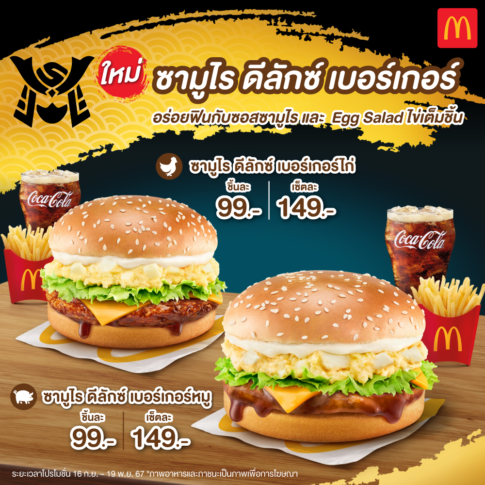 แมคโดนัลด์ ต่อยอดความอร่อยจากเมนูฮิตตลอดกาล ‘ซามูไรเบอร์เกอร์’ ภายใต้คอนเซ็ปต์ ‘ปลุกสปิริตความเป็นซามูไรในตัวคุณ เพื่อทำทุกวันให้ดีขึ้น’ เหมือนกับซามูไรเบอร์เกอร์ ที่ยังคงพัฒนาความอร่อยอย่างไม่หยุดยั้ง พิเศษ! ด้วยเมนูใหม่ที่อร่อยฟินกว่าเดิม กับ ‘ซามูไร ดีลักซ์ เบอร์เกอร์’ ขั้นกว่าของความอร่อยที่จัดเต็มรสชาติอันเป็นเอกลักษณ์ของซอสซามูไรสุดชุ่มฉ่ำสูตรเฉพาะของแมคโดนัลด์ ฟินยิ่งขึ้นกับ Egg Salad สไตล์ญี่ปุ่น ไข่เต็มชิ้นคลุกเคล้ากับน้ำสลัดรสกลมกล่อม พร้อมเชดด้าชีสสุดลงตัว และยังเลือกอร่อยได้ทั้งหมูและไก่ ในราคาเริ่มต้นเพียงชิ้นละ 99 บาทเท่านั้น หรืออิ่มคุ้มเป็นชุดพร้อมเฟรนช์ฟรายส์ขนาดกลาง และโค้ก 16 ออนซ์ เริ่มต้นเพียงชุดละ 149 บาท