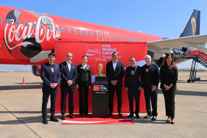 พิธีต้อนรับถ้วยฟุตบอลโลกได้รับเกียรติจาก เซลแมน คาเรกา (ที่ 4 จากซ้าย) ประธานภูมิภาคอาเซียนและแปซิฟิกตอนใต้ เดอะ โคคา-โคล่า คัมปะนี และ จิลแบร์โต ซิลวา(Gilberto Silva) (ที่ 5 จากซ้าย) ตำนานนักเตะฟุตบอลโลกจากบราซิล ผู้เคยคว้าแชมป์ฟุตบอลโลกปี 2002 ซึ่งมาร่วมต้อนรับและถ่ายภาพกับถ้วย FIFA World Cup Trophy ของจริง ซึ่งทำจากทองคำ 18 กะรัต