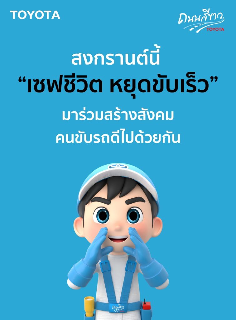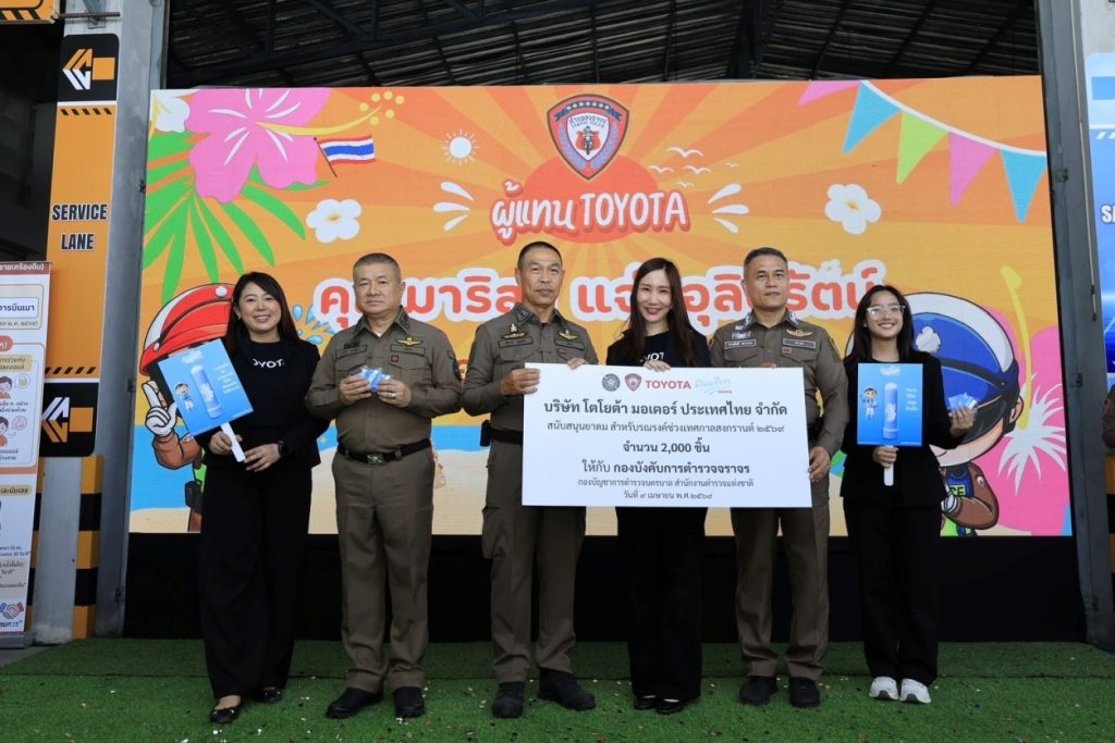 ในช่วงเทศกาลสงกรานต์ปีนี้ โตโยต้าได้ร่วมมือกับ 3 หน่วยงานหลัก ได้แก่ กรมคุมประพฤติกรมป้องกันและบรรเทาสาธารณภัย (ปภ.) และกองบังคับการตำรวจจราจร (บก.จร.) สนับสนุนอุปกรณ์สำหรับกิจกรรมรณรงค์และการตั้งจุดพักรถใน 8 จังหวัดสำคัญทั่วประเทศ ได้แก่ กรุงเทพมหานคร ฉะเชิงเทรา นครราชสีมา ชลบุรี พระนครศรีอยุธยา นครสวรรค์ ราชบุรี และเพชรบุรี โดยมีการมอบยาดมรวม 30,000 ชิ้น เพื่อแจกจ่ายให้ผู้ขับขี่รู้สึกสดชื่น ผ่อนคลายระหว่างการเดินทาง พร้อมเสื้อกั๊กสะท้อนแสงจำนวน 500 ตัว สำหรับอาสาสมัครในพื้นที่ เพื่อเสริมความปลอดภัยตลอดช่วงการเดินทาง