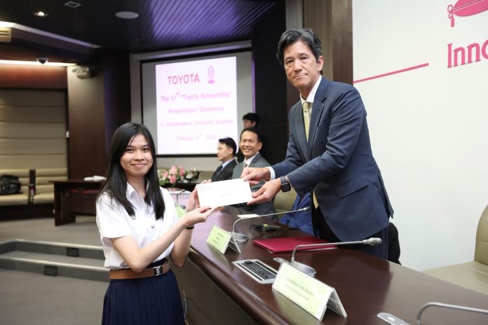 โดยโตโยต้า ได้จัดกิจกรรมมอบทุนสนับสนุนแก่นิสิตจุฬาลงกรณ์มหาวิทยาลัย มาตั้งแต่ปี พ.ศ. 2516 จนถึงปัจจุบัน รวมทั้งสิ้น 1,615 ทุน มูลค่า 21,522,000 บาท โดยในปีนี้ มีนิสิตเข้ารับทุนดังกล่าวจำนวน 12 ทุน มูลค่าทุนละ 80,000 บาท รวมทั้งหมดเป็นมูลค่า 960,000 บาท โดยมีรายละเอียดดังนี้