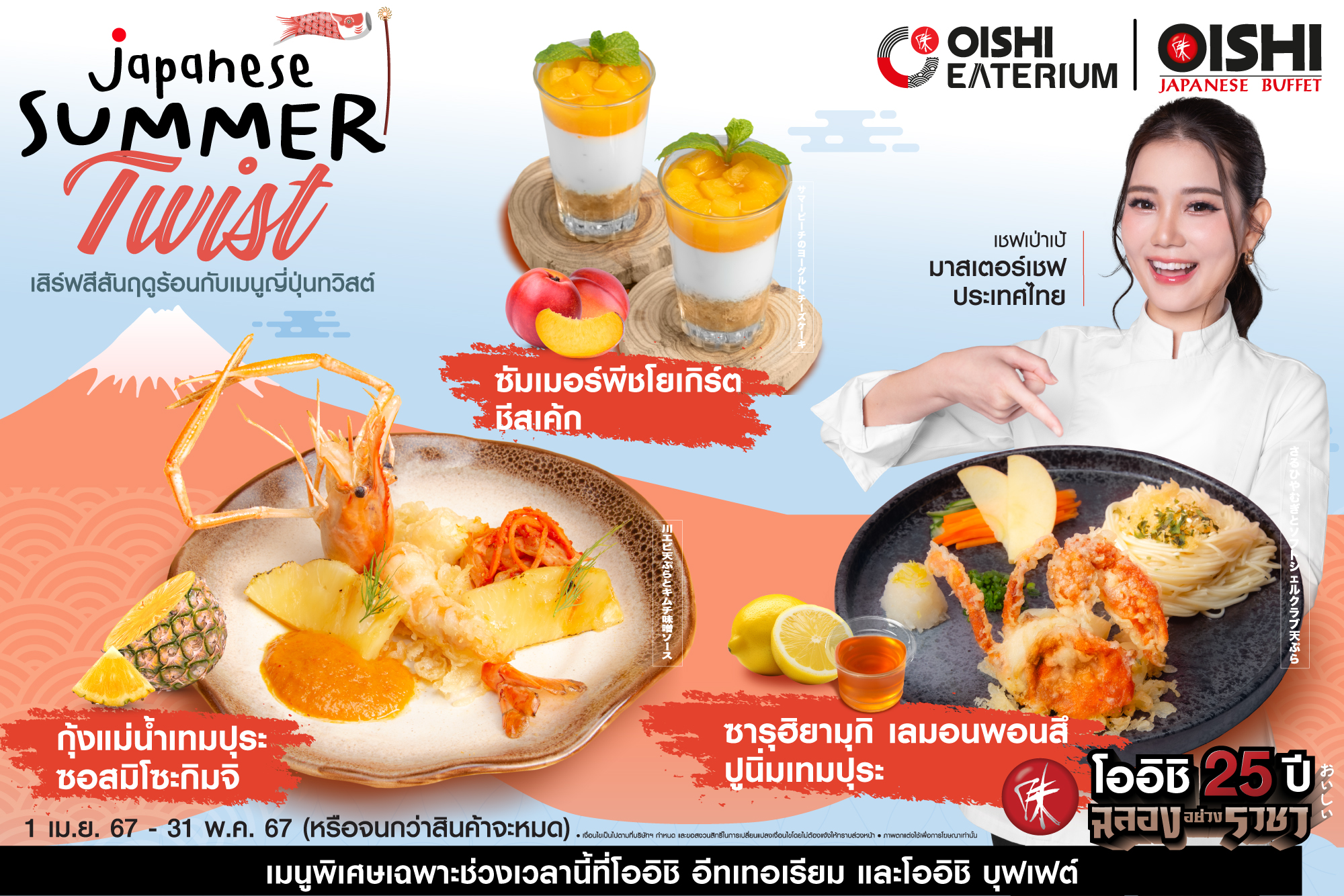 อิ่ม โอ-ร่อย เทศกาล “Japanese Summer Twist” พร้อมเมนูใหม่ในธีม “Japanese Sense & Inspiration” ขอแนะนำอาหารจานพิเศษ…รสชาติที่มีชีวิตชีวา แบบฉบับ เชฟเป่าเป้ มาสเตอร์เชฟ ประเทศไทย พลาดไม่ได้ ทั้ง เมนู “กุ้งแม่น้ำเทมปุระ ซอสมิโซะกิมจิ” เมนูที่คัดสรรกุ้งแม่น้ำตัวโต ๆ มาทอดในสไตล์เทมปุระ เสิร์ฟมากับน้ำซอสสูตรพิเศษ ที่ผสานรสชาติความเข้มข้นของกิมจิและความกลมกล่อมของมิโซะ…สุดลงตัว รับประทานพร้อมสับปะรดคาราเมลไลซ์ ให้รสชาติที่อร่อยและสดชื่นไม่เบา เมนู “ซารุฮิยามุกิ ปูนิ่มเทมปุระ” เสิร์ฟฮิยามุกิ (หรืออุด้งเส้นเล็ก) แบบเย็น ๆ เส้นเหนียวนุ่ม คู่ซอสพอนสึเลมอน เปรี้ยวกลมกล่อม รับประทานพร้อมปูนิ่มเทมปุระ ผัก และแอปเปิ้ลดอง หลากสีสัน เป็นเมนูที่ช่างสดชื่นและลงตัว และ เมนูขนมหวาน “ซัมเมอร์พีชโยเกิร์ตชีสเค้ก” ชีสเค้ก เนื้อสัมผัสเนียนนุ่ม เติมรสชาติเปรี้ยวอมหวาน…ลงตัว ด้วยโยเกิร์ต และซอสลูกพีชเข้มข้น รับประทานแบบเย็น ๆ ยิ่งอร่อยชื่นใจไปอีก