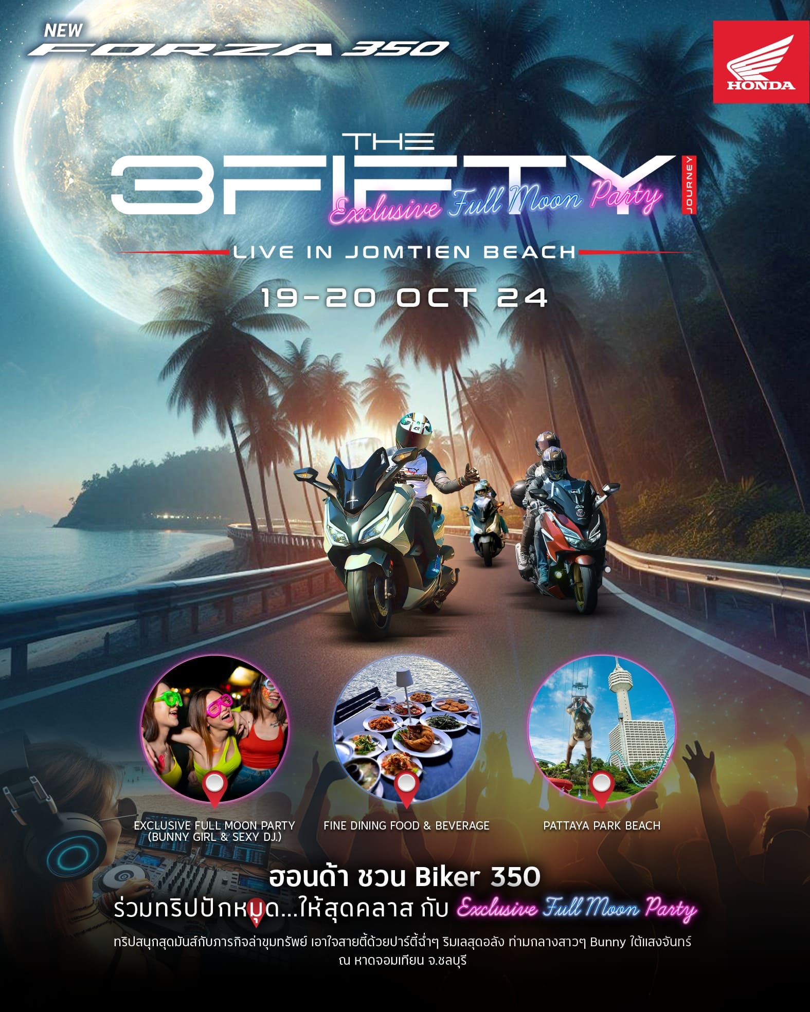 สำหรับกิจกรรม ‘The 3Fifty Journey’ สุดเอ็กซ์คลูซีฟ ผู้เข้าร่วมจะได้ทดสอบสมรรถนะของ New Honda Forza350 ได้อย่างเต็มที่ ขับขี่บนเส้นทางกรุงเทพฯ – ชลบุรี ที่เต็มไปด้วยสถานที่ท่องเที่ยวที่สำคัญ ให้ได้แวะเช็คอินและถ่ายภาพ โดยมีกูรูให้คำแนะนำเทคนิคการถ่ายภาพด้วยมือถือสำหรับสายคอนเทนต์โดยเฉพาะ ปิดท้ายด้วยความสนุกสนานในปาร์ตี้ริมหาด พบกับแขกรับเชิญพิเศษ ‘Bunny Girls’ และ ‘Sexy DJ’ ที่จะมาสร้างสีสันความสนุกในค่ำคืน Full Moon และส่งท้ายความมันส์กับกิจกรรมแอดเวนเจอร์ที่พัทยาปาร์ค