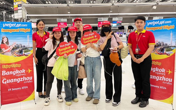 สายการบินไทยเวียตเจ็ทสยายปีกสู่อีกหนึ่งจุดหมายปลายทางในประเทศจีน เริ่มให้บริการเที่ยวปฐมฤกษ์บินตรงเชื่อมต่อระหว่าง กรุงเทพฯ – กวางโจว เมื่อวันที่ 19 มกราคม 2567 สอดรับโครงการยกเว้นวีซ่านักท่องเที่ยวสำหรับผู้ถือหนังสือเดินทางสัญชาติจีนตามการเสนอนโยบายของรัฐบาลไทย