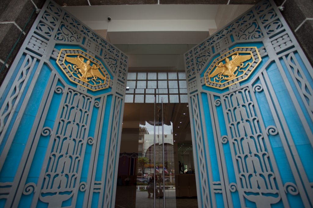 ภาพที่หลายคนคุ้นชินกับองค์พญาครุฑส่วนใหญ่จะมีความตระการตาในด้านศิลปะ ลวดลายไทย ที่ศิลปินล้วนบรรจงวาด บรรจงปั้น แต่ที่นี่ต้องบอกว่ามีความแตกต่างเพราะเป็นงานประติมากรรมที่ออกแบบโดย ศาสตราจารย์ศิลป์ พีระศรี บิดาแห่งงานศิลปะสมัยใหม่ของไทย โดยองค์พญาครุฑยุดแตรงอนทั้งสององค์ เป็นประติมากรรมปูนปั้นลอยตัวขนาดใหญ่โดดเด่นในท่ากางปีกอย่างมีพละกำลัง กล้ามเนื้อและลักษณะทางกายวิภาคมีความแข็งแรง น่าเกรงขาม ไม่ว่าจะมองในระยะใกล้หรือไกลจะสังเกตได้ชัดเจนว่าไม่ได้มีลวดลายประดับตกแต่งอ่อนช้อย มีความแปลกตาด้วยสีชมพูคล้ายสีผิวของมนุษย์ โดยสีชมพูที่เราเห็นกันทุกวันนี้มีที่มาจากระหว่างการซ่อมแซม บริเวณที่ไม่ค่อยโดนแดดเป็นสีคล้ายกับปูนกินหมาก ทางกรมศิลปากรจึงทาสีตามการเปลี่ยนแปลงนี้  ทั้งนี้หากใครได้เคยไปเที่ยวตามอาคารทรงตะวันตกจะพบว่าองค์พญาครุฑนี้มีความเป็นสไตล์ตะวันตกไม่น้อยเลยทีเดียว