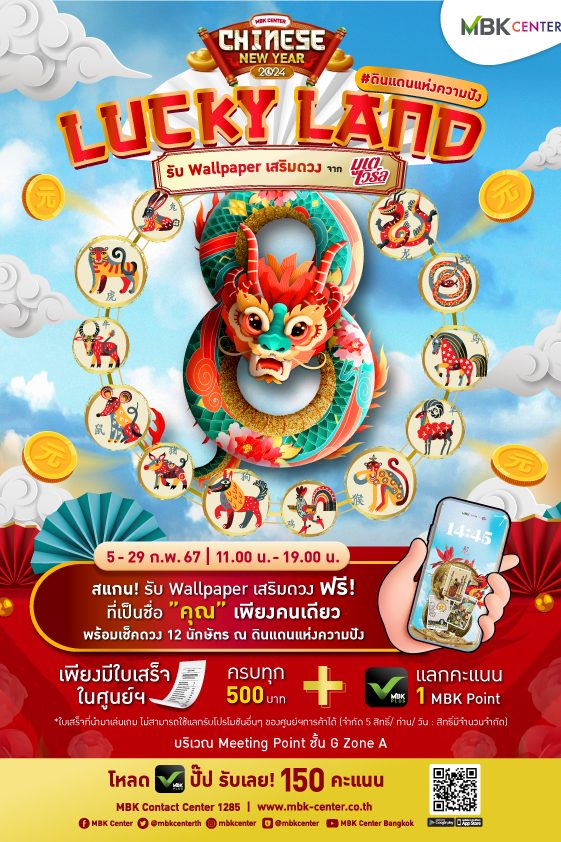 นอกจากนี้ ชวนคุณมากเสริมความปังกับกิจกรรม Lucky Land เพียงสแกน! รับ Wallpaper มงคล เสริมดวงฟรี! จาก มูเตเวิร์ล ที่เป็นชื่อ “คุณ” เพียงคนเดียว พร้อมเช็คดวง 12 นักษัตร ณ ดินแดนแห่งความปัง เพียงมีใบเสร็จร้านค้าภายในศูนย์ฯ ครบทุก 500 บาท + แลกคะแนน MBK Plus 1 MBK Point (จำกัด 5 สิทธิ์ / ท่าน / วัน : สิทธิ์มีจำนวนจำกัด) ตั้งแต่วันจันทร์ที่ 5 – วันพฤหัสบดีที่ 29 กุมภาพันธ์ 2567 ทั้ง 4 ศูนย์การค้าในเครือเอ็ม บี เค