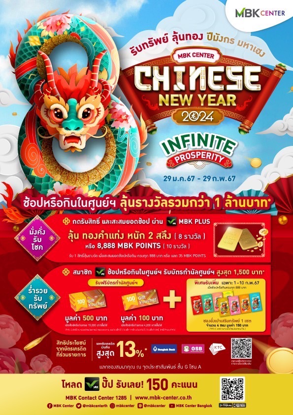 นายสมพล ตรีภพนารถ ประธานเต้าหน้าที่บริหารศูนย์การค้า บริษัท เอ็ม บี เค จำกัด (มหาชน) จัดงานต้อนรับเทศกาลตรุษจีน CHINESE NEW YEAR 2024 ศูนย์การค้าเครือเอ็ม บี เค ได้แก่ เอ็ม บี เค เซ็นเตอร์ พาราไดซ์ พาร์ค เดอะไนน์ เซ็นเตอร์ พระราม 9 เดอะไนน์ เซ็นเตอร์ ติวานนท์ ชวนลุ้นรางวัลกว่า 1 ล้านบาท กับแคมเปญ “Infinite Prosperity รับทรัพย์ ลุ้นทอง ปีมังกร มหาเฮง” พิเศษสำหรับสมาชิก MBK PLUS ช้อปปั๊บ รับทรัพย์ปุ๊บ ลุ้นทอง รับคะแนน MBK PLUS Points สูงสุด 888 คะแนน และเครดิตเงินคืนจากบัตรเครดิตที่ร่วมรายกายสูงสุด 13 % ตั้งแต่วันจันทร์ที่ 29 มกราคม – วันพฤหัสบดีที่ 29 กุมภาพันธ์ 2567
