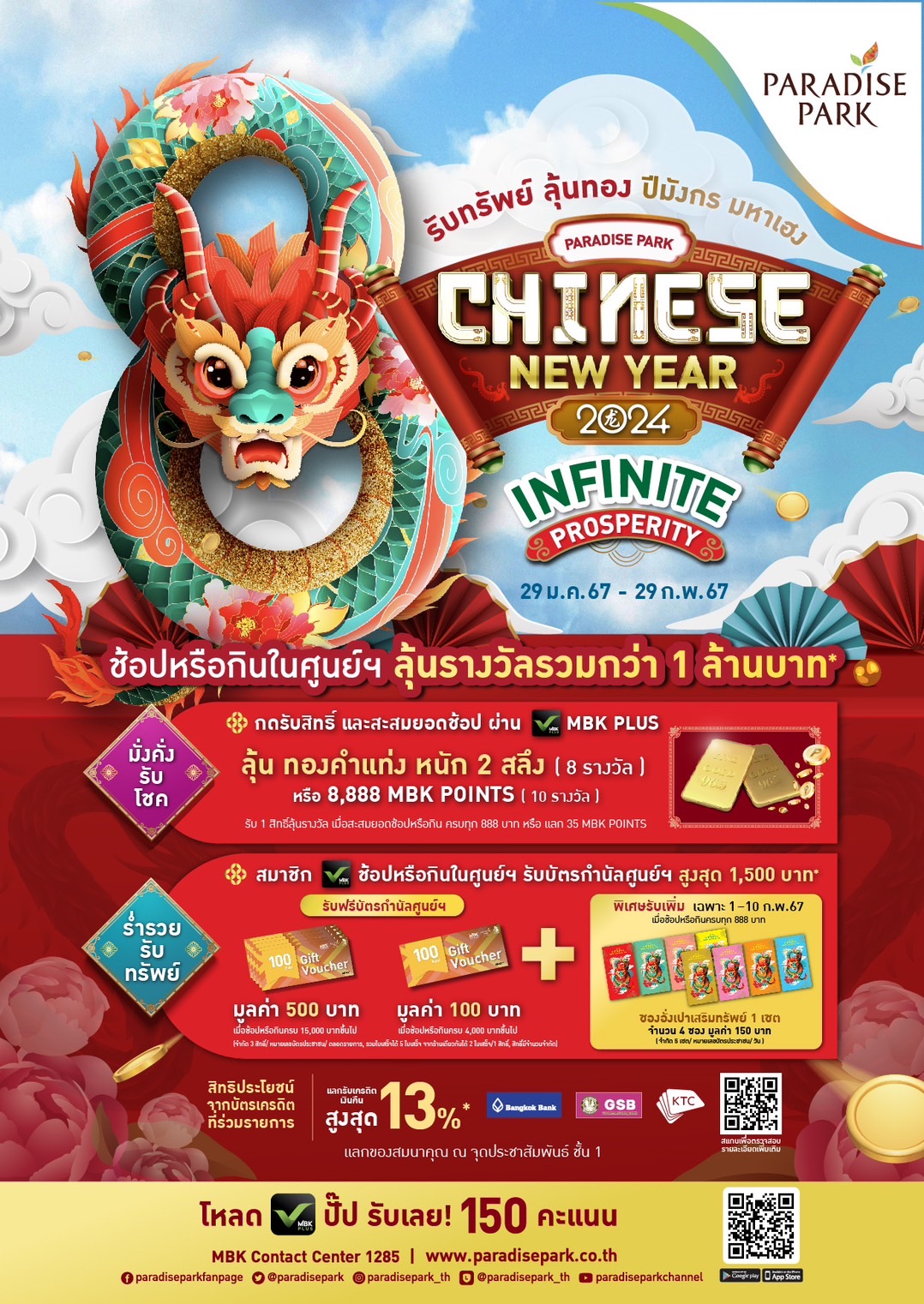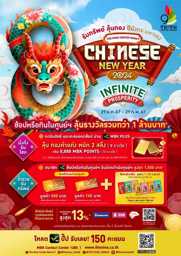 ต่อ 2 ร่ำรวยรับทรัพย์ : ช้อปหรือกินในเอ็ม บี เค เซ็นเตอร์ และพาราไดซ์ พาร์ค ครบตามเงื่อนไข และกดรับสิทธิ์ผ่าน MBK PLUS รับฟรี บัตรกำนัลศูนย์ฯ รวมใบเสร็จช้อป – อิ่มในศูนย์ฯ ครบ 4,000 บาทขึ้นไป รับบัตรกำนัลศูนย์ฯ มูลค่า 100 บาท (จำกัดรวม 750 สิทธิ์/ ตลอดรายการ) รวมใบเสร็จช้อป – อิ่มในศูนย์ฯ ครบ 15,000 บาทขึ้นไป รับบัตรกำนัลศูนย์ฯ มูลค่า 500 บาท (จำกัดรวม 500 สิทธิ์/ ตลอดรายการ) พิเศษ!! รวมใบเสร็จช้อป – อิ่มในศูนย์ฯ ครบทุก 888 บาท รับซองอั่งเปาเสริมทรัพย์ 1 เซต มูลค่า 150 บาท (จำกัดรวม 550 สิทธิ์/ ตลอดรายการ) เฉพาะวันที่ 1-10 กุมภาพันธ์ 2567 ส่วนเดอะไนน์เซ็นเตอร์ พระราม 9 และเดอะไนน์ เซ็นเตอร์ ติวานนท์ รวมใบเสร็จช้อป – อิ่มในศูนย์ฯ ครบ 2,000 บาทขึ้นไป รับบัตรกำนัลศูนย์ฯ มูลค่า 100 บาท (จำกัดรวม 300 สิทธิ์/ ตลอดรายการ) รวมใบเสร็จช้อป – อิ่มในศูนย์ฯ ครบ 8,000 บาทขึ้นไป รับบัตรกำนัลศูนย์ฯ มูลค่า 500 บาท (จำกัดรวม 150 สิทธิ์/ ตลอดรายการ) พิเศษ!! รวมใบเสร็จช้อป – อิ่มในศูนย์ฯ ครบทุก 555 บาท รับซองอั่งเปาเสริมทรัพย์ 1 เซต มูลค่า 150 บาท (จำกัดรวม 300 สิทธิ์/ ตลอดรายการ) เฉพาะวันที่ 1-10 กุมภาพันธ์ 2567