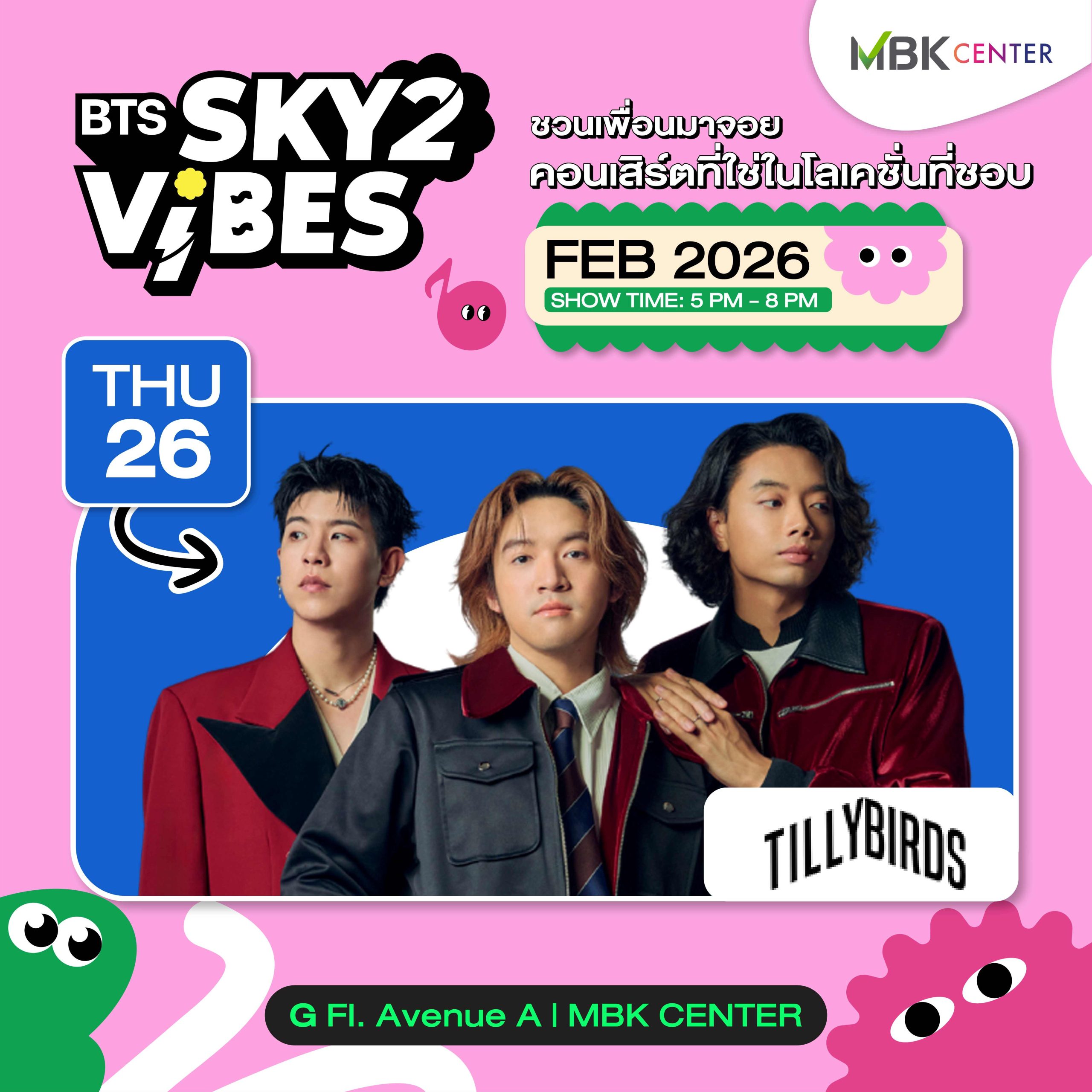 ต่อเนื่องความมันส์ส่งท้ายเดือนกุมภาพันธ์ ศูนย์การค้าเอ็ม บี เค เซ็นเตอร์ ชวนสายแดนซ์มาร่วมร้องร่วมเต้นสนุกกันใน ฟรีคอนเสิร์ต BTS SKY VIBES 2  โดย GMM MUSIC ร่วมกับ VGI & Plan ปล่อยจอยกับคอนเสิร์ตที่ใช่ในโลเคชันที่ชอบ กับเหล่าศิลปินสุดฮอต จัดเต็ม 3 วัน ในวันอังคารที่ 24 กุมภาพันธ์ พบกับ The White Hair Cut, วันพฤหัสบดีที่ 26 กุมภาพันธ์ พบกับ TILLYBIRDS และ วันศุกร์ที่ 27 กุมภาพันธ์ 2569 พบกับวงร็อคfreehand พร้อมกิจกรรมพิเศษอีกมากมาย อาทิRandom Dance Stage, Student Stage, BLKGEM x GMM Trainee Show, Sponsor Booth & Lucky Draw เป็นต้น ตั้งแต่ 17.00 น. – 20.00 น. บริเวณชั้น G ลานกิจกรรมเอ็ม บี เค อเวนิว โซน A