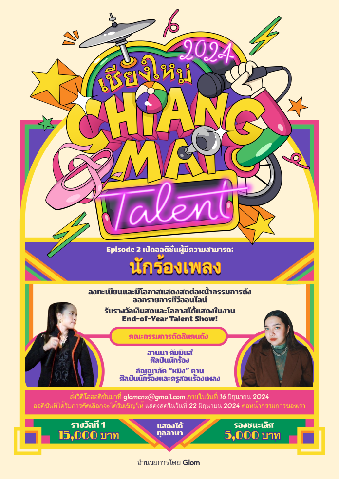 หลังจากประสบความสำเร็จอย่างน่าเหลือเชื่อกับ Chiang Mai Talent ตอนที่ 1 ในเดือนเมษายนที่ผ่านมา Glom กลับมาพร้อมกับ Chiang Mai Talent ตอนที่ 2 โดยจัดขึ้นในวันที่ 22 มิถุนายน 2567! โดยเปิดให้สมัครและส่งวิดีโอเข้ามาเพื่อออดิชั่นเหมือนกับครั้งก่อน โดยธีมในครั้งนี้คือ “การร้องเพลง”!