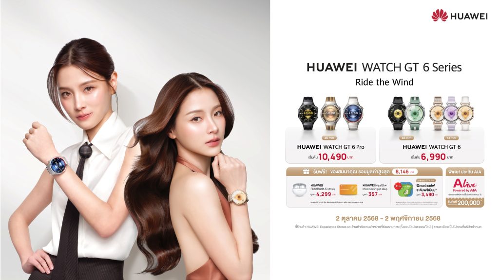 HUAWEI WATCH GT 6 Series พร้อมเป็นเพื่อนคู่ใจสายสปอร์ตไปในทุกเส้นทาง โดย HUAWEI WATCH GT 6 Pro (46 มม.) ราคาเริ่มต้น 10,490 บาท มีให้เลือกทั้งสีดำ สีน้ำตาล และสีไทเทเนียม ส่วน HUAWEI WATCH GT 6 (46 มม.) ราคาเริ่มต้น 6,990 บาท มาพร้อมสีเขียว และสีดำ และ HUAWEI WATCH GT 6 (41 มม.) ราคาเริ่มต้น 6,990 บาท มีให้เลือกในสีม่วง สีขาวสายหนัง และสีทอง Milanese Gold  พิเศษ! เมื่อซื้อระหว่าง 2 ตุลาคม 2568 – 2 พฤศจิกายน 2568 รับของสมนาคุณมูลค่ารวมสูงสุด 8,146 บาท[1] อาทิ HUAWEI FreeBuds 6i (สีขาว) มูลค่า 4,299 บาท, HUAWEI Health+ Membership 3 เดือน มูลค่า 357 บาท และฟีเจอร์กอล์ฟระดับพรีเมียม มูลค่า 3,490 บาท[2] (เฉพาะรุ่น HUAWEI WATCH GT 6 Pro เท่านั้น) พร้อมประกันภัย ALive Powered by AIA คุ้มครองชีวิตจากการเจ็บป่วยและอุบัติเหตุ 1 ปี สูงสุด 200,000 บาท