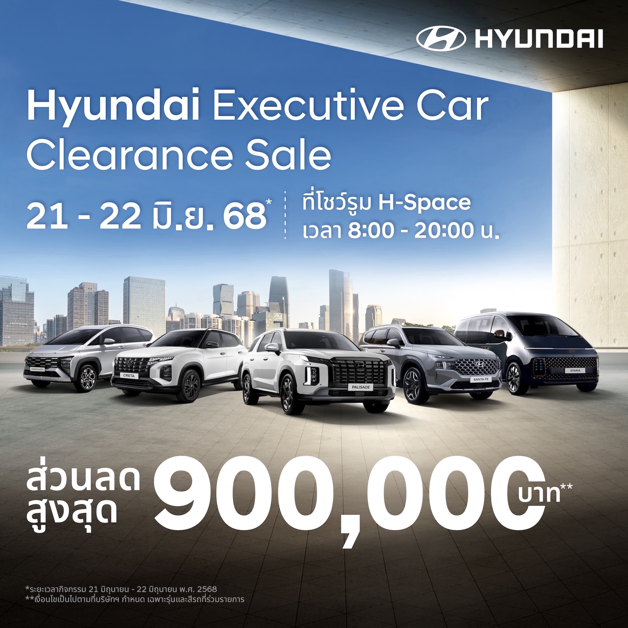 ฮุนได โมบิลิตี้ (ประเทศไทย) ขอเชิญสัมผัสประสบการณ์เลือกซื้อรถยนต์ผู้บริหารไมล์น้อยคุณภาพระดับพรีเมียมในราคาที่คุ้มเกินคาด “Hyundai Executive Car, Clearance Sale” ครั้งแรกของงานรถไมล์น้อยป้ายแดงและรถยนต์จัดแสดงสภาพเยี่ยมจากฮุนได พร้อมข้อเสนอสุดเร้าใจ จัดเต็มครบทุกรุ่นทุกเซกเมนต์ โอกาสดี ๆ มีแค่ 2 วันเท่านั้น วันที่ 21–22 มิถุนายนนี้เท่านั้น ณ โชว์รูม Hyundai H-Space วิภาวดี 8 โมงเช้า ถึง 8 โมงเย็น จำนวนจำกัด