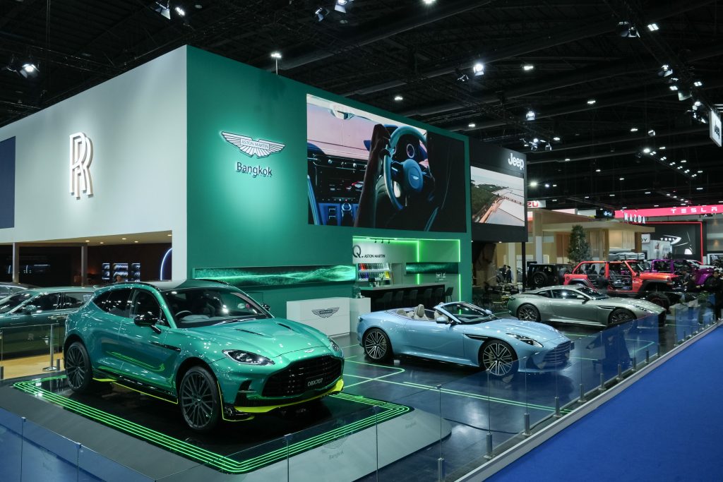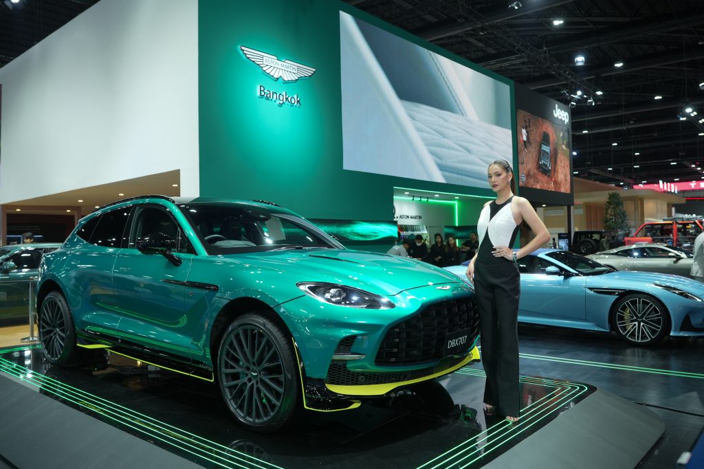 บูธ แอสตัน มาร์ติน นำเสนอเรื่องราวของแบรนด์ที่เปี่ยมด้วยดีเอ็นเอของมอเตอร์สปอร์ต และได้แรงบันดาลใจจากเทคโนโลยีในสนามแข่ง ถ่ายทอดความเชื่อมโยงระหว่างโลกของการแข่งขัน และยนตรกรรมระดับอัลตรา-ลักชัวรี่ ควบคู่กับการอำลาบทบาทของ แอสตัน มาร์ติน ดีบีเอ็กซ์707 เอเอ็มอาร์ (DBX707 AMR) ที่ใช้เป็นรถสำหรับทีมแพทย์ในการแข่งฟอร์มูลาวัน (F1 Medical Car) อีกทั้งยังได้รับการสนับสนุนจากพันธมิตรทางธุรกิจระดับโลก Glenfiddich และ Elemis สรรสร้างกิจกรรมพิเศษ เพื่อนำเสนอประสบการณ์ลักชัวรี่ไลฟ์สไตล์เหนือระดับ