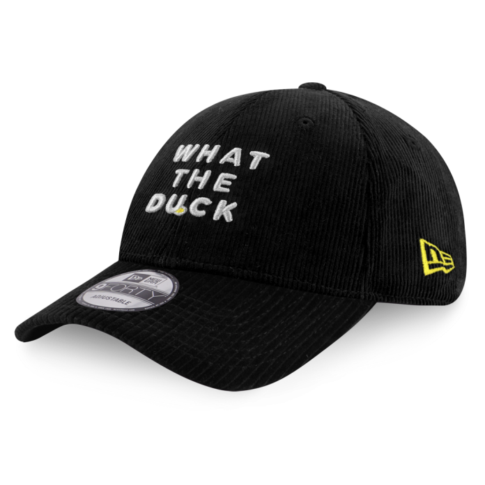 หมวกรุ่นลิมิติด อิดิชัน ดีไซน์พิเศษนี้ ผสมผสานกลิ่นอายที่เป็นเอกลักษณ์ของ New Era เข้ากับความสนุกและขี้เล่นของ What The Duck โดยตัวหมวกผลิตจากผ้าลูกฟูก Corduroy สีดำ ในรุ่น 9FORTY สุดฮิตของ New Era ที่สามารถปรับขนาดได้เอง ตามคอนเซ็ปต์ OSFM (One Size fit most) ของทางแบรนด์ พร้อมดีเทลปักฟ้อนโลโก้ What The Duck สีขาวแซมสีเหลือง สีซิกเนเจอร์ของค่าย พร้อมสายคาดหลังหมวกสีเหลือง ปักข้อความ Music & More เพื่อเพิ่มดีเทลที่พิเศษมากยิ่งขึ้นให้กับหมวกสุดพิเศษรุ่นนี้