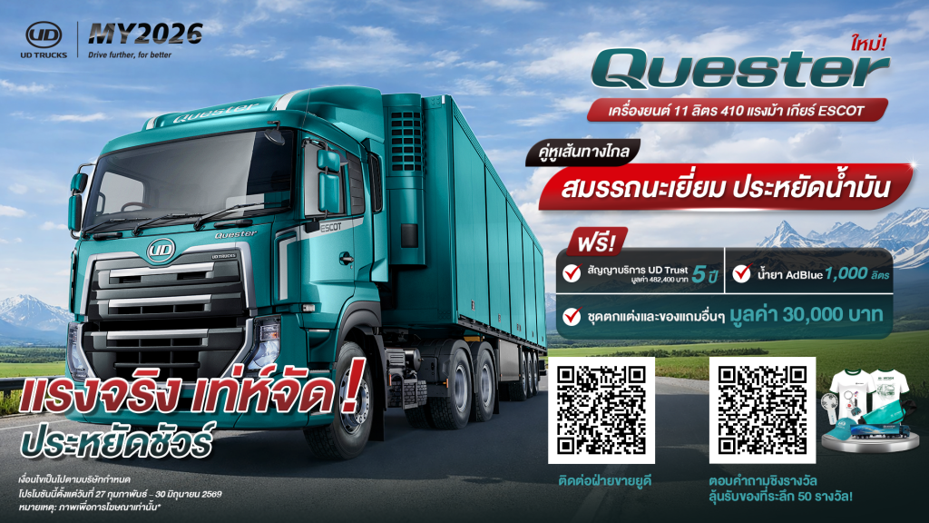 - UD Trucks เปิดตัว Quester รุ่นใหม่ MY2026 เครื่องยนต์ 8 ลิตร จัดเต็มพร้อมเกียร์ ESCOT และโปรโมชั่นสุดคุ้ม